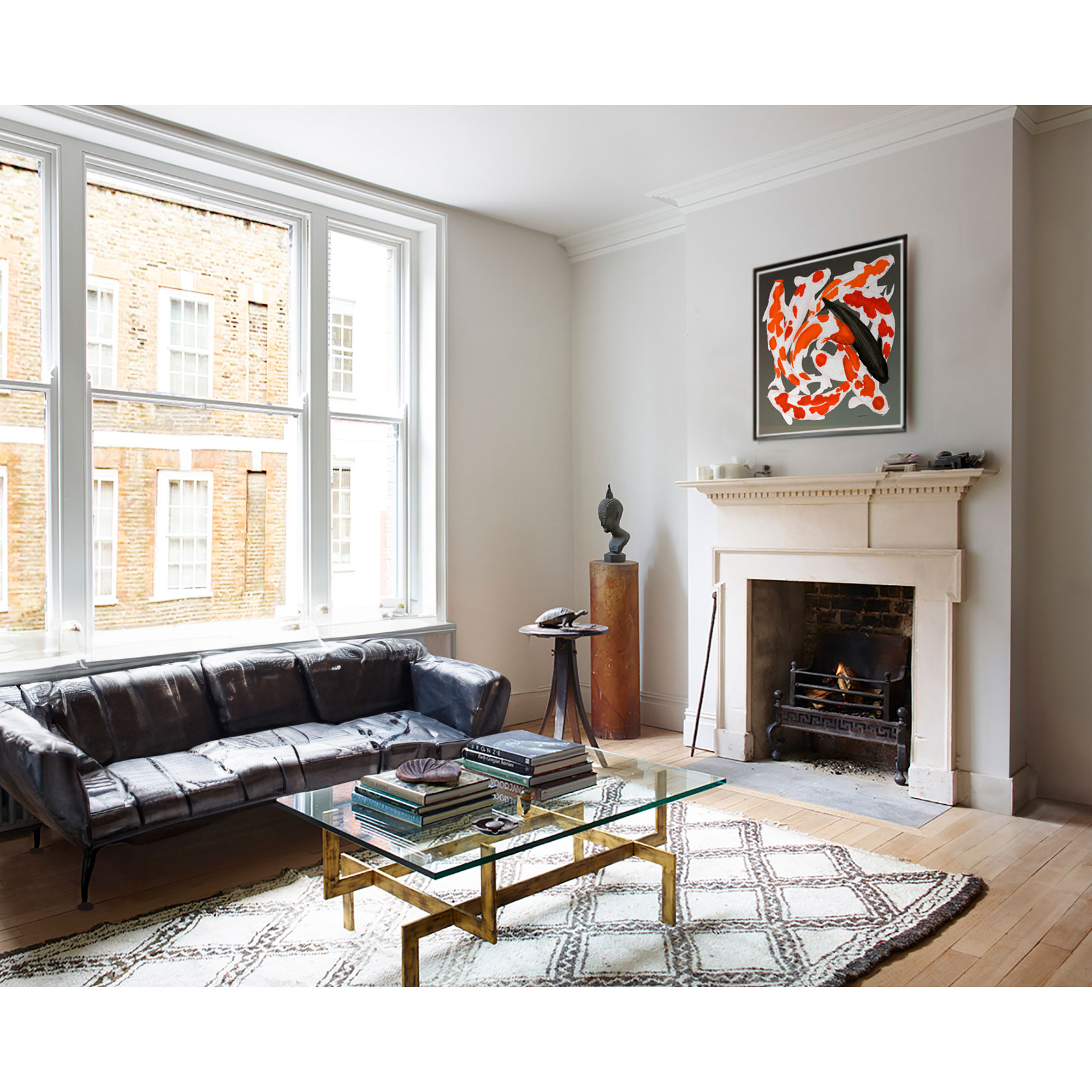 There are nine koi, eight red and white ‘Kohaku’ Koi, and single black. This combination is considered to be particularly auspicious, as it contains the lucky number eight combined with one black Koi which is believed to absorb bad luck. The artist plays with these symbolic associations, fascinated by our need to find meaning and influence in a complex and multifaceted reality.