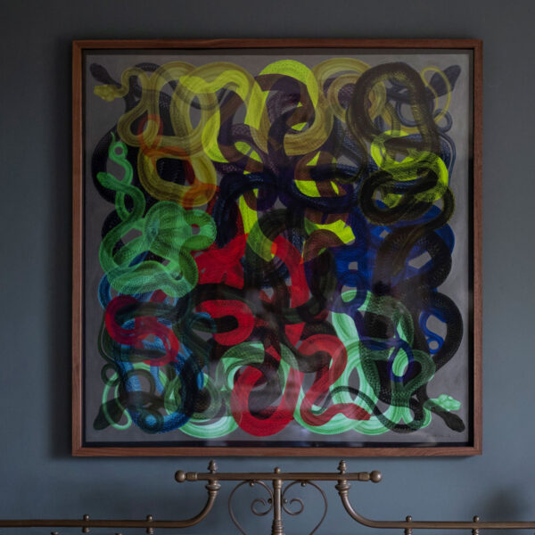 Across cultures and centuries, the snake has been a potent mythological symbol, at once revered and reviled. It coils through our collective unconscious as healer and destroyer, protector and deceiver. It is the ouroboros of ancient alchemy, the serpent in Eden, Kundalini energy, the feared viper… in its many forms the snake elicits a uniquely dual emotional response of fascination and fear in equal measure. However, in Snakes I there is no value judgement, the symbolic ambivalence that snakes have carried through history is merely infusing the image with layers of complexity, providing space to reconnect with our deeper desires and fears. The snake as a symbol is first and foremost a healer and an ancient world creator, hopefully guiding us to heal the deep rifts in our inner and outer worlds.